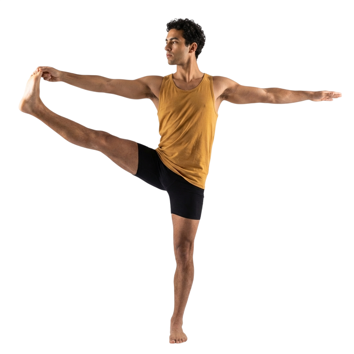 Builds balance and stability. Strengthens standing leg and core. Stretches hamstrings and hip flexors. Develops focus.