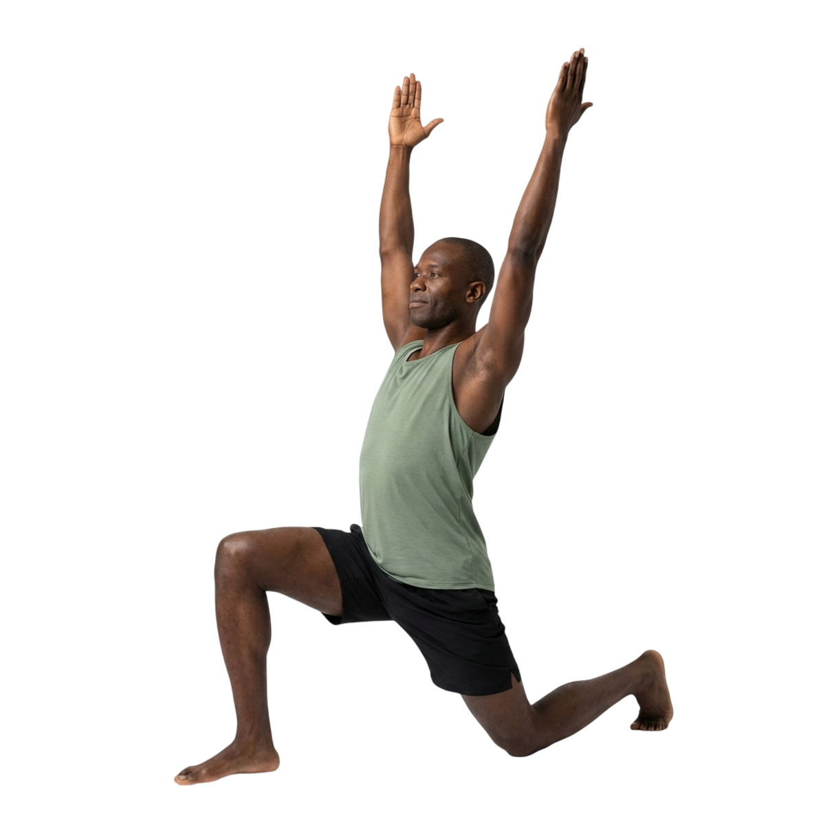 - 5Arms reach overhead or hands rest on front thigh